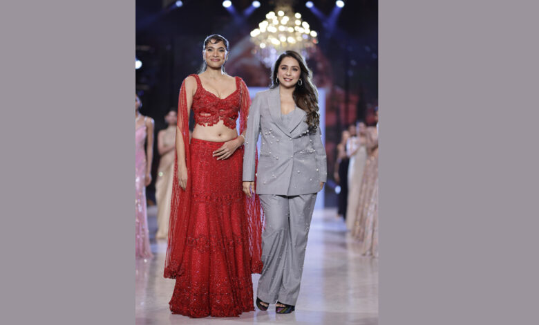 Sonaakshi Raaj’s collection, aptly named “The First Kiss,” mesmerized attendees by translating the emotional intensity and romance of intimate moments into fabric, color, and movement. Featuring 20 to 30 exquisitely detailed ensembles crafted from luxurious materials such as delicate tulle, silk, and organza, the collection balanced intricate floral embellishments and a gentle sheen with bold, sculptural shapes. Its palette gracefully transitioned from soft blush, ivory, and gold to deeper, passionate shades of crimson and midnight.